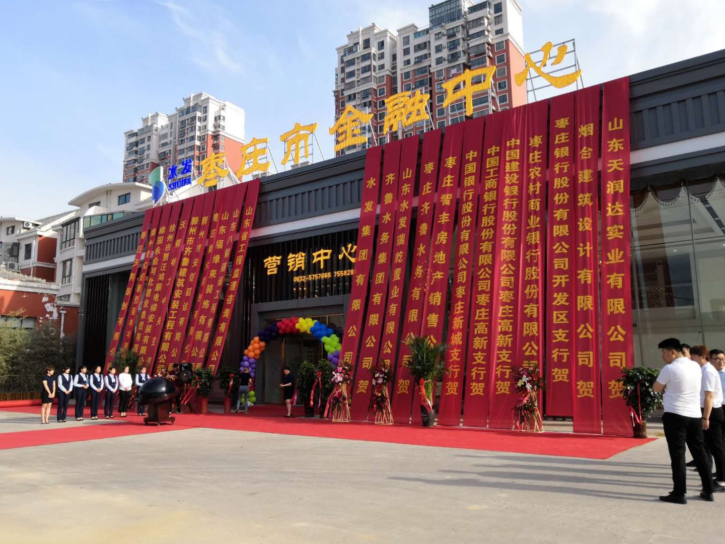 5月24日上午8:00,枣庄市金融中心项目营销中心盛大开馆。齐鲁水务集团有限公司总经理助理孙玉国、山东水发瑞乾置业有限公司董事长朱元相、副董事长马瑞等人上台共同启动了水晶球, 宣布营销中心正式开馆。